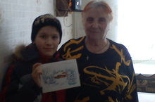 Ученик 5 класса Мухаметханов Артур поздравил ветерана войны Лаптеву Валентину Леонидовну, вручил ей новогоднюю открытку, прочитал стихотворение.