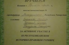 Ученица 11 класса МБОУ "СОШ №3г.Мамадыш" Багурина Екатерина в составе команды "Магистры права" приняла участие в III республиканском историко-правовом турнире в г.Казань. В рамках турнира учащиеся продемонстрировали свои знания основ права, умения дискутировать, представлять свои аргументы. По результатам турнира команда "Магистры права" заняла четвертое место в республике.