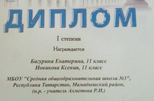 Ученицы 11 класса Багурина Екатерина,Новикова Ксения выступили с докладом на Поволжской научной конференции им.Н.И.Лобачевского в г.Казани. (научный руководитель учитель истории Ахметова Р.И.)По результатам работы конференции жюри высоко оценило работу учащихся и присудило первое место.Поздравляем участниц и желаем дальнейших успехов.