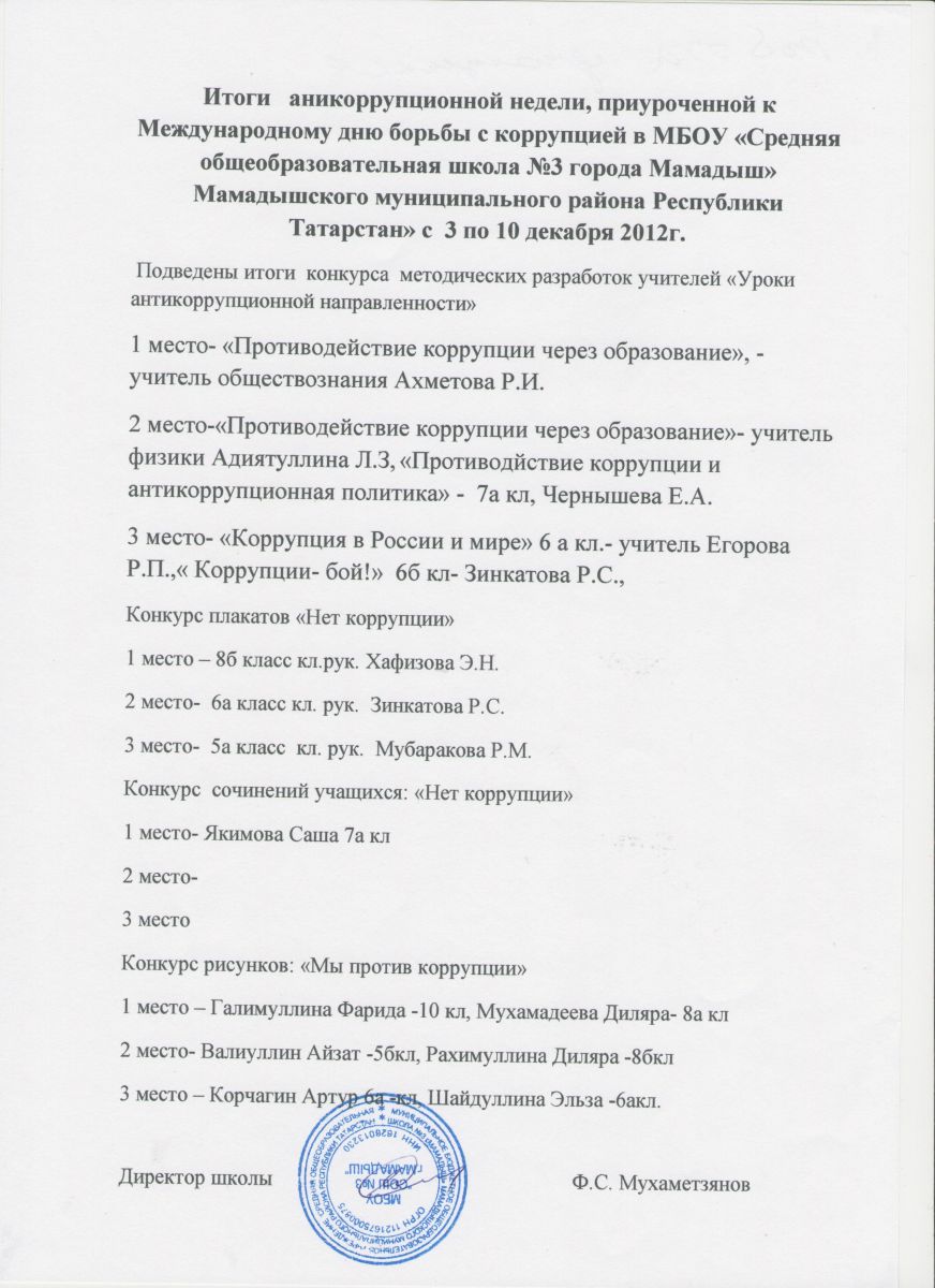 Итоги антикоррупционной недели МБОУ "СОШ №3 г.Мамадыш"