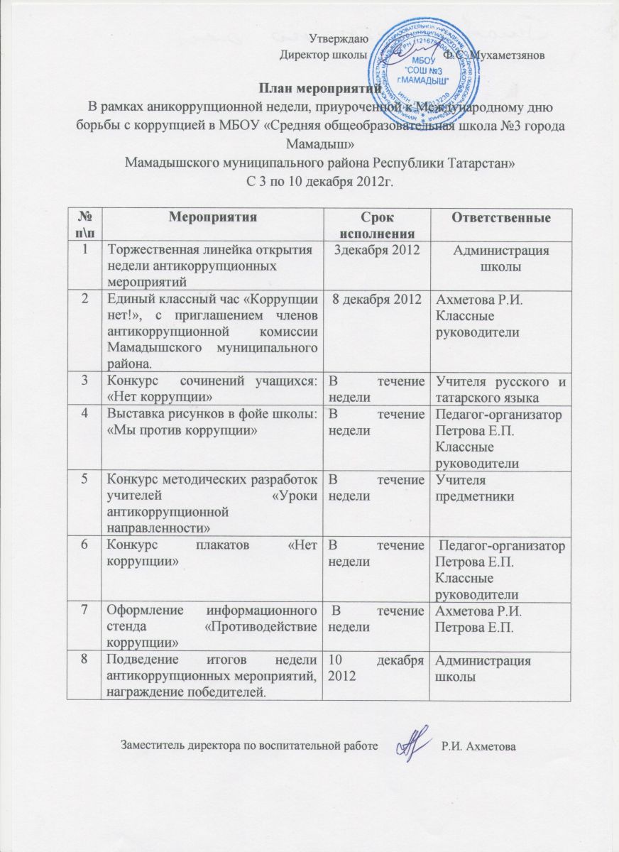 План работы по антикоррупции МБОУ "СОШ №3 г.Мамадыш"