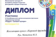 Дипломом участника III Республиканского детско-юношеского фестиваля национальных культур "Радуга - Салават күпере" награждена коллекция кукол "Хоровод дружбы". (Руководитель Мудведева Н.Л.)