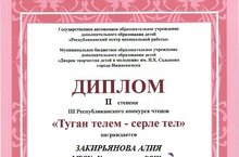 Закирьянова Алия(5 класс) награждена дипломом 2 степени III Республиканского конкурса чтецов "Туган телем - серле тел". в г. Нижнекамск. Руководитель: Васильева Р.А., учитель татарского языка и литературы.