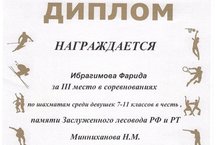 26 марта 2016 года обучающаяся 11 класса нашей школы Ибрагимова Фарида участвовала в соревнованиях по шахматам среди 7-11 классов в честь памяти Заслуженного лесовода РФ и РТ Минниханова Н.М., которые состоялись в поселке Лесхоз Сабинского муниципального района РТ.