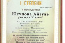 Дипломом I степени награждена обучающаяся 6 Б класса Юсупова Айгуль за победу во Всероссийском конкурсе "Закладка для любимой книги" с работой "Закладка для книг".