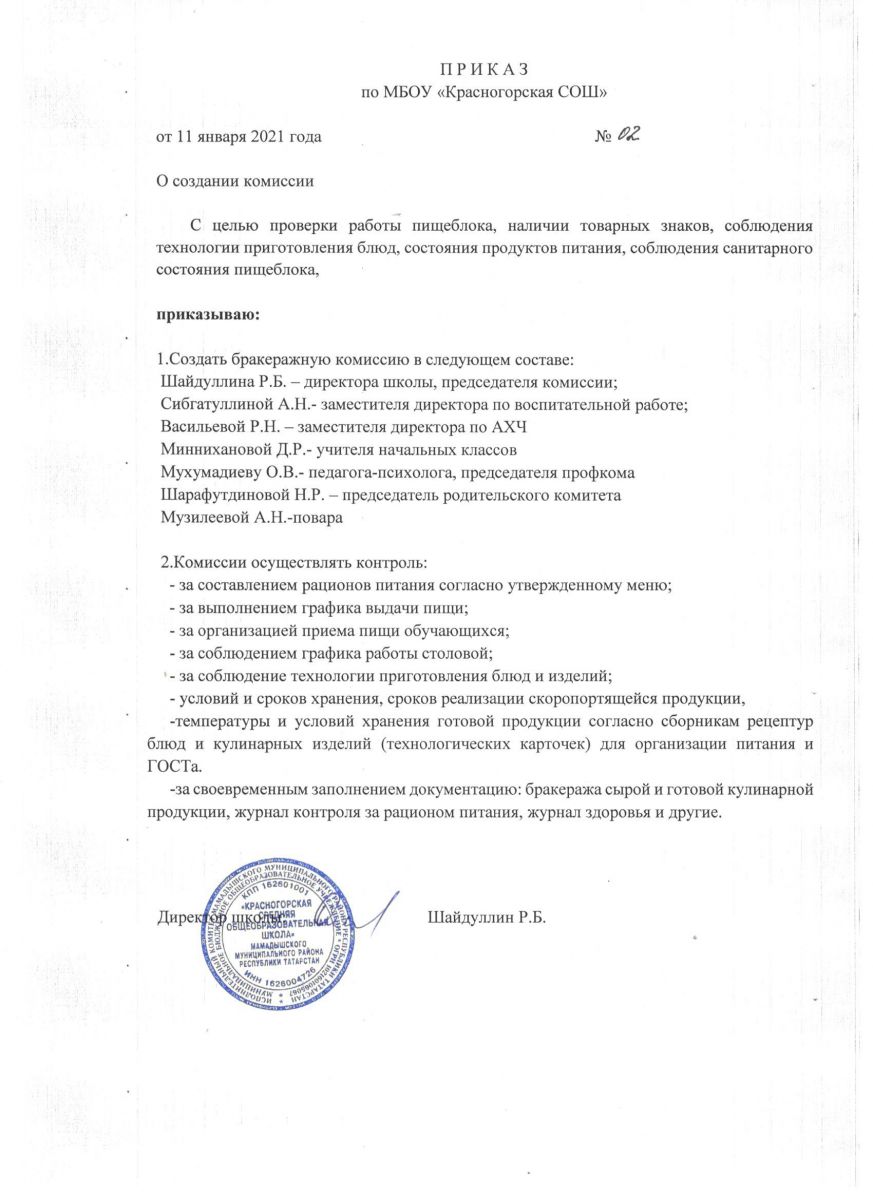 Приказ о создании бракеражной комиссии на 2021 г.