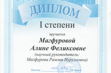 Магфурова Алина, ученица 11б класса, приняла участие в конференции и была награждена Дипломом 1 степени (руководитель Магфурова Р.Н.). Мы вас поздравляем и желаем дальнейших побед!