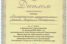 В нашем районе проходили финальные соревнования по шашкам (2003-2004 г.р.) регионального этапа Всероссийской Спартакиады МО и Н РТ Российской Федерации среди обучающихся общеобразовательных организаций РТ, в котором учащиеся нашей школы заняли призовые места: Мартынова Дарина, 5б класс - 3 место, Юнусова Эльвира, 5а класс - 2 место (руководитель Хамидуллина Э.М., Хадиев Р.В.). В общем зачете команда Мамадышского муниципального района заняла 1 место. Все были награждены дипломами и кубками. Мы вас поздравляем и желаем дальнейших побед!