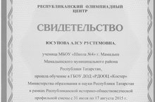 Юсуповой Алсу, ученице 11б класса, было выдано свидетельство о том, что она прошла обучение в ГБОУ ДОД "РДООЦ "Костер" МО и Н РТ в рамках Республиканской историко-обществоведческой профильной смены.
