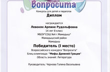 Дипломом победителя Всероссийского конкурса "Вопросита" награждается Левонян Арпине, ученица 8б класса (руководитель Чернова Г.В.) Мы вас поздравляем и желаем дальнейших побед!