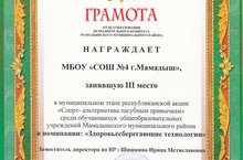 Грамотой МКУ "Отдел образования" награждается наша школа, занявшая 3 место в муниципальном этапе республиканской акции "Спорт - альтернатива пагубным привычкам" среди обучающихся общеобразовательных учреждений Мамадышского муниципального района в номинации "Здоровьесберегающие технологии".