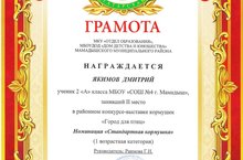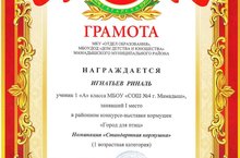 Грамотой МКУ "Отдел образования", МБОУ ДОД "Дом детства и юношества" награждается Игнатьев Риналь, ученик 1а класса, занявший 1 место в районном конкурсе-выставке кормушек "Город для птиц" в номинации "Стандартная кормушка" (1 возрастная категория). Поздравляем и желаем дальнейших побед!