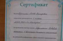 Сертификат выдан Воронцовой Любовь Викторовне, классному руководителю 1б класса, за проведение мастер-класса "Современные Globallab технологии в воспитании в классном коллективе" на районной конференции "День классного руководителя" 5 ноября 2014 года на базе МБОУ "Лицей №2 г. Мамадыш".