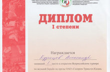 Дипломом I степени награждается Кузнецов Александр, учащийся 8б класса, занявший 1 место в открытом Всероссиийском турнире по вольной борьбе на призы ОАО "Газпром Трансгаз-Казань", посвященный 55-летию Мастера спорта СССР, Заслуженного тренера России Булатова Равиля Габдулхаковича. Мы поздравляем Александра и желаем дальнейших побед.
