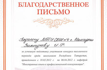 Казанский национальный исследовательский технологический университет наградил сертификатом ученика 4 класса Хабибрахманова Раиля за активное участие в конкурсе творческих работ «Вперед в прошлое -2012», проходившем в КНИТУ. Руководитель работы - учительница начальных классов Саттарова Алсу Наиловна.