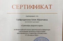 Наша ученица 10 класса Гайфутдинова Алия выступила в Всероссийской научно-практической конференции "Актуальные вопросы подготовки школьников и студентов к профессии" с докладом "Сувениры родного края".