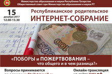 15 декабря 2017 года с 12.00-13.30 состоится Республиканское родительское Интернет-собрание на тему "Поборы и пожертвования - что общего и в чем разница?". Онлайн трансляция на сайте киу.рф. Вопросы принимаются на сайте roditelirt@mail.ru