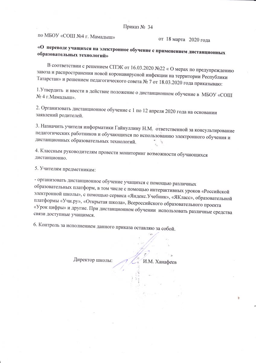 Инструкция для родителей учащихся МБОУ «СОШ №4 г. Мамадыш» по переходу на обучение с применением электронного обучения и дистанционных образовательных технологий