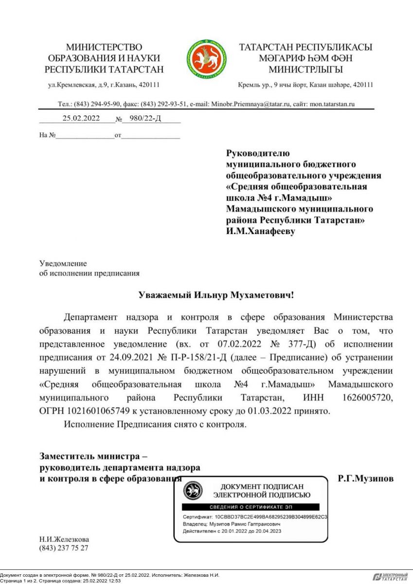 Муниципальное бюджетное общеобразовательное учреждение «Средняя общеобразовательная школа № 4 города Мамадыш» Мамадышского муниципального района РТ / Татарстан Республикасы Мамадыш муниципаль районы муниципаль бюджет гомуми белем учреждениесе «Мамадыш шәһәренең дүртенче санлы урта гомуми белем мәктәбе"