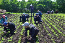 "Хезмәт" лагерында ял итүче укучылар мәктәп яны яшелчә бакчасында кишер түтәлләрен чүп үләннәрдән арындыра.