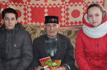 Фотода 8 нче класс укучылары Фәйзрахман бабайны котларга дип килгәннәр.