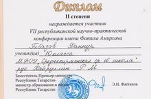 10 нчы класс укучысы Гибазов Фаннур Фатих Әмирхан укуларында катнашып, 2 нче дәрәҗә диплом белән бүләкләнде. Фәнни җитәкче Хайруллин Р.М.