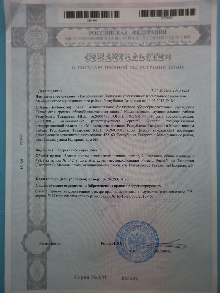 Cвидительство о государственной регистрации права здания школы