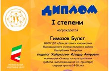 C 9 ноября 2020 года по 22 января 2021 года проведен Республиканский конкурс по ЗD-моделированию, посвященный 85-летию киностудии «Союзмультфильм». В Конкурсе приняли участие 16 обучающихся из 11 образовательных организаций 11 территорий Республики Татарстан: Агрызского, Арского, Буинского, Заинского, Кайбицкого, Кукморского, Мамадышского, Пестречинского, Сабинского муниципальных районов, городов Набережные Челны, Казань. Наши воспитанники Хадиуллин Аяз (педагог Гурьев Р.Г.) и Гимазов Булат (педагог Хайруллин И.А.) были награждены дипломами первой степени. Поздравляем и желаем дальнейших успехов.