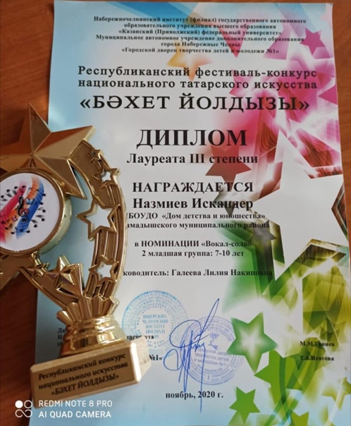 Наш воспитанник Назмиев Искандер принял участие в республиканском конкурсе-фестивале национального татарского искусства «Бәхет йолдызы» в г.Набережные Челны и стал обладателем звания лауреат 3 степени (Педагог Галеева Л.Н.). Поздравляем и желаем дальнейших успехов и побед!