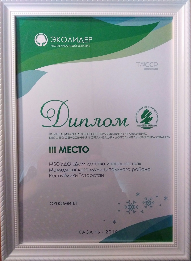 В номинации «Экологическое образование в организациях высшего образования и организациях дополнительного образования» МБОУ ДО "Дом детства и юношества" заняла 3 место. -