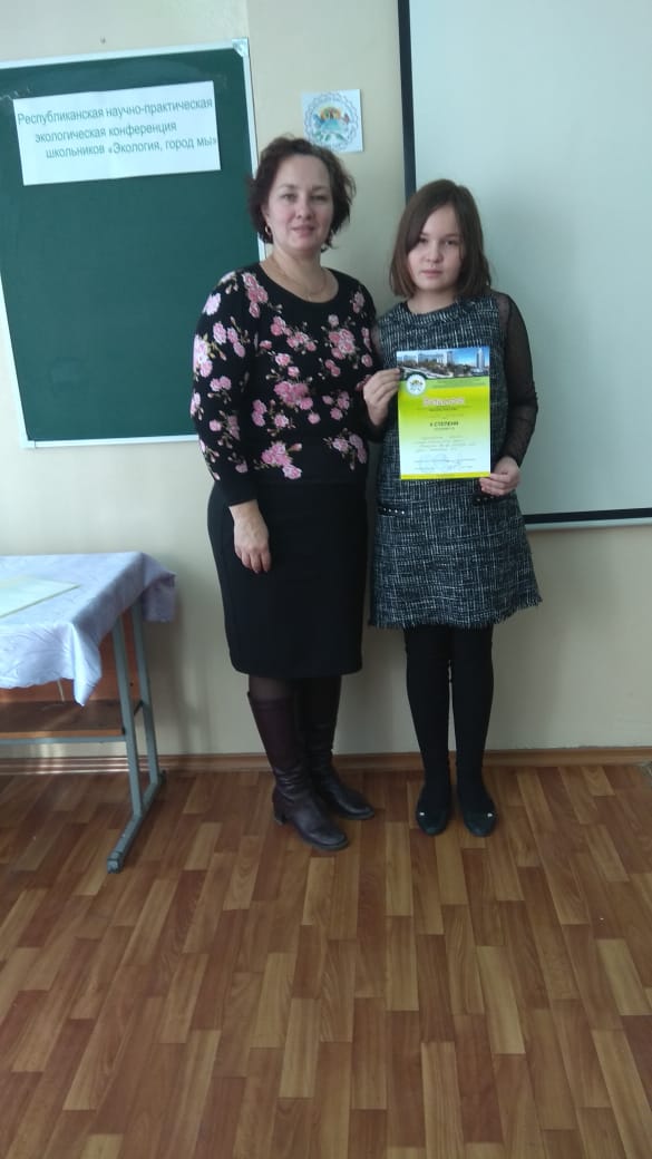 30 октября наши воспитанники объединений «Эколог-исследователь» и «Азбука земли» приняли участие в республиканской научно-практической экологической конференции школьников «Экология, город и мы». Мустафина Азалия защитила работу на тему: Экологическое состояние дендрофлоры парка Победы» и заняла 2 место (руководитель Запольская Е.Н.), Шайхутдинова Алсу выступила с работой «Межгодовая динамика населения птиц города Мамадыш» и заняла 1 место (руководитель Соловьёва Е.А.).