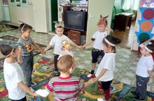 Русс теле дэресендэ без балалар белэн русс халкынын "Колобок" экиятен сэхнэлэштердек. Балалар рольлэрне узлэре сайлап алдылар. Театральләштерү аша балаларның сүзлек байлыгын үстерү, активлаштыру, шигырь юлларын истә калдыру, чиста hәм сәнгатьле итеп сөйләргә өйрәтү;