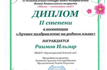 Мәктәпкәчә яшьтәге балалар арасында уздырылган II Региональ "Мама мое - солнышко!" видео котлау конкурсында, "Лучшее поздравление на родном языке" номинациясендә, Раимов Ильзиребез II урын алып, "Диплом"га лаек булды.