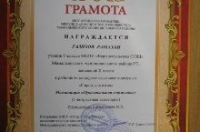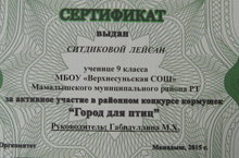 Сертификат МКУ "Отдел образования", МБОУ ДОД "Дом детства и юношества" за активное участие в районном конкурсе-выставке кормушек "Город для птиц" выдан Ситдиковой Лейсан, ученице 9 класса, Гарипову Радилю, ученику 5 класса, Назиповой Дине, ученице 2 класса, Хадиуллину Искандеру, ученику 2 класса . Поздравляем и желаем дальнейших побед!