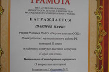Грамотой МКУ "Отдел образования", МБОУ ДОД "Дом детства и юношества" награждается Шакиров Нафис, ученик 9 класса, занявший 2 место в районном конкурсе-выставке кормушек "Город для птиц" в номинации "Стандартная кормушка" (3 возрастная категория). Поздравляем и желаем дальнейших побед!