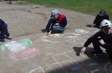 Балачакка сәяхәт көне. Бүген балалар “Ура!Каникуллар башланды”темасына асфальтта рәсем ясадылар. “Джунглилар чакыра” уенында актив катнаштылар