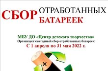 МБУ ДО "Центр детского творчества" организует ежегодный сбор отработанных батареек. В срок до 31 мая принеси старые батарейки в любой пункт приёма (детский сад, школа, ЦДТ) и сделай природу чище???? Также батарейки можно сдать в специальный контейнер, расположенный по адресу ул.Г.Тукая, д.6.