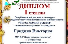 Воспитанники и педагоги Центра детского творчества приняли участие в Республиканской выставке- конкурсе прикладного творчества экологической направленности "Чудеса своими руками", организатор выставки "Детский эколого-биологический центр" г. Елабуга.