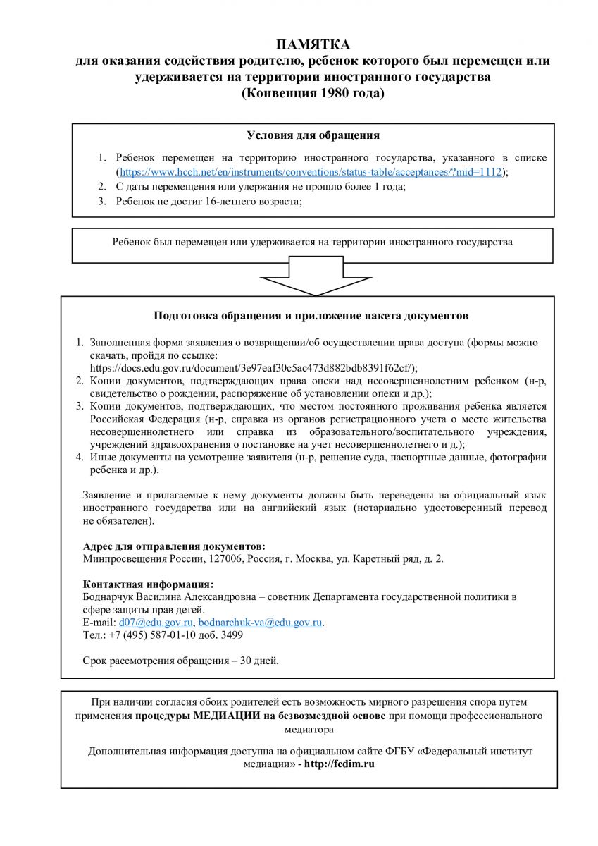 ПАМЯТКА для оказания содействия родителю, ребенок которого был перемещен или удерживается на территории иностранного государства (Конвенция 1980 года) 06.08.2020