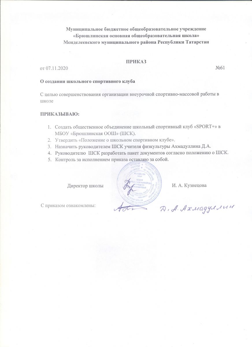 Приказ об организации работы ШСК "СПОРТ+" в 2023-2024 учебном году