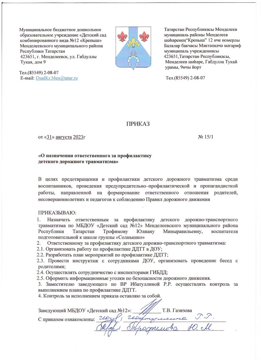 - Приказ о назначении ответственного за профилактику ДДТТ