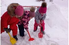 Кругом бело, много снега намело... Дети старшей группы "Колокольчики" во время прогулки помогают убирать снег на участке.