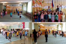 В понедельник дети старших и подготовительных групп собрались в музыкальном зале для церемонии поднятия государственного флага и исполнения гимна России. Церемония поднятия флага проходит в 8:00. /Дүшәмбе көнне өлкән һәм мәктәпкә әзерлек төркемнәре балалары Дәүләт Флагы күтәрелү һәм Россия гимнын башкару тантанасы өчен музыка залына җыелды.Флагны күтәрү тантанасы сәгать иртәнге сигездә уза.