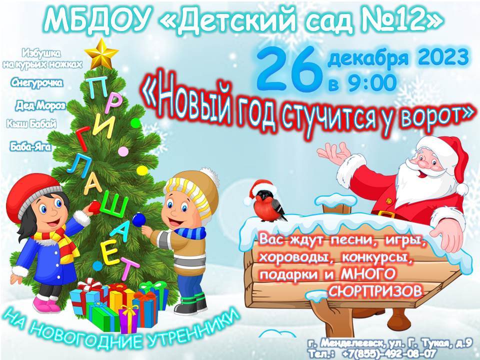 Опубликовано: 16.12.2023Уважаемые родители! Поздравляем Вас с наступающим Новым годом и приглашаем на наши Новогодние утренники, которые пройдут в музыкальном зале нашего детского сада, согласно утвержденному графику. Утренники пройдут с соблюдением санитарно-эпидемических и антитеррористических мероприятий.