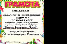 Ценным подарком и Почётной грамотой награждён педагогический коллектив «Золотой рыбки» во главе с заведующей Грицук Е.А. за участие в работе районной конференции «Экология. Безопасность. Жизнь» в рамках реализации проекта «Спасение маленьких речек Менделеевска».