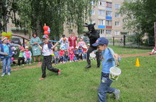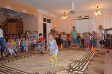 В летний период ДОУ работает в особом режиме: закаливающие процедуры, свежий воздух, активный образ жизни, развлекательные мероприятия и праздники. 30 июля в детском саду состоялся спортивный праздник «А ну-ка, мальчики и девочки», в котором приняли участие все группы. Ребята, разделившись на 2 команды – «Звёздочки» и «Радуга» , упорно боролись за победу: кто быстрее добежит через препятствия, прыжки с мячом и многое другое. Праздник украсили стихи из уст юных спортсменов, физкультминутки. Заведующая Г.Гудовская отметила важность здорового образа жизни, уделение большого внимания спорту, ведь недаром чемпионат мира по водным видам спорта проходит в нашей республике. Всем участникам были вручены сладкие подарки от спонсоров – родителей (семья Алексеевых), за что им огромное спасибо! Праздник оставил у детей радостные впечатления!