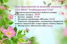Урааа !!!"Весенние каникулы!" 24.03.2023 Весенние школьные каникулы короткие, не успеешь оглянуться – снова пора в школу!На весенних каникулах в МБОУ "Енабердинская СОШ" пройдут различные мероприятия: - досуговые мероприятия - спортивные мероприятия - подготовка к экзаменам - поездки Не стоит терять времени даром! С пользой проведённые весенние каникулы, обязательно положительно скажутся на учёбе! Приходите! С нами не будет скучно!