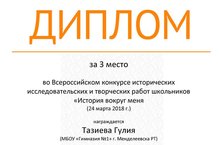 Несмотря на то, что шли каникулы, некоторые гимназисты активно участвовали в конкурсах и конференциях. Тазиева Гулия - ученица 9 класса заняла 3 место во Всероссийском конкурсе исторических исследовательских и творческих работ школьников «История вокруг меня"...