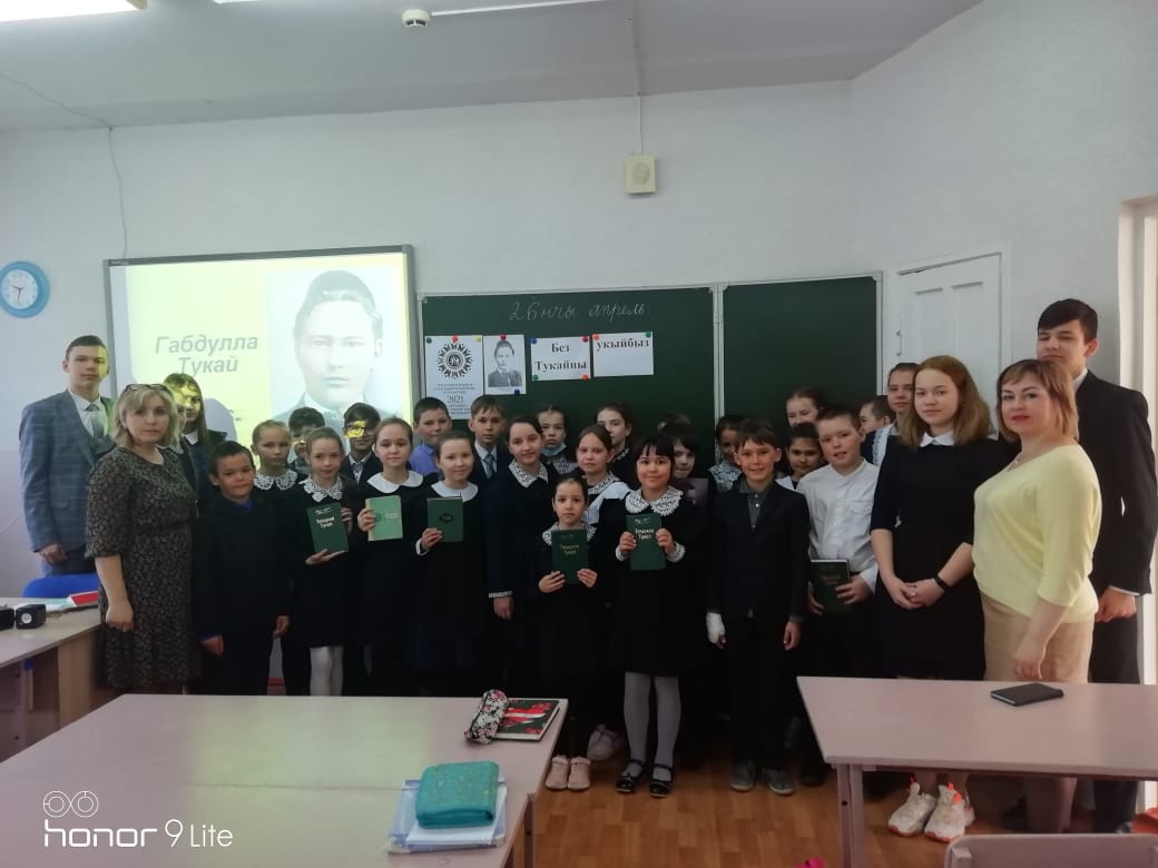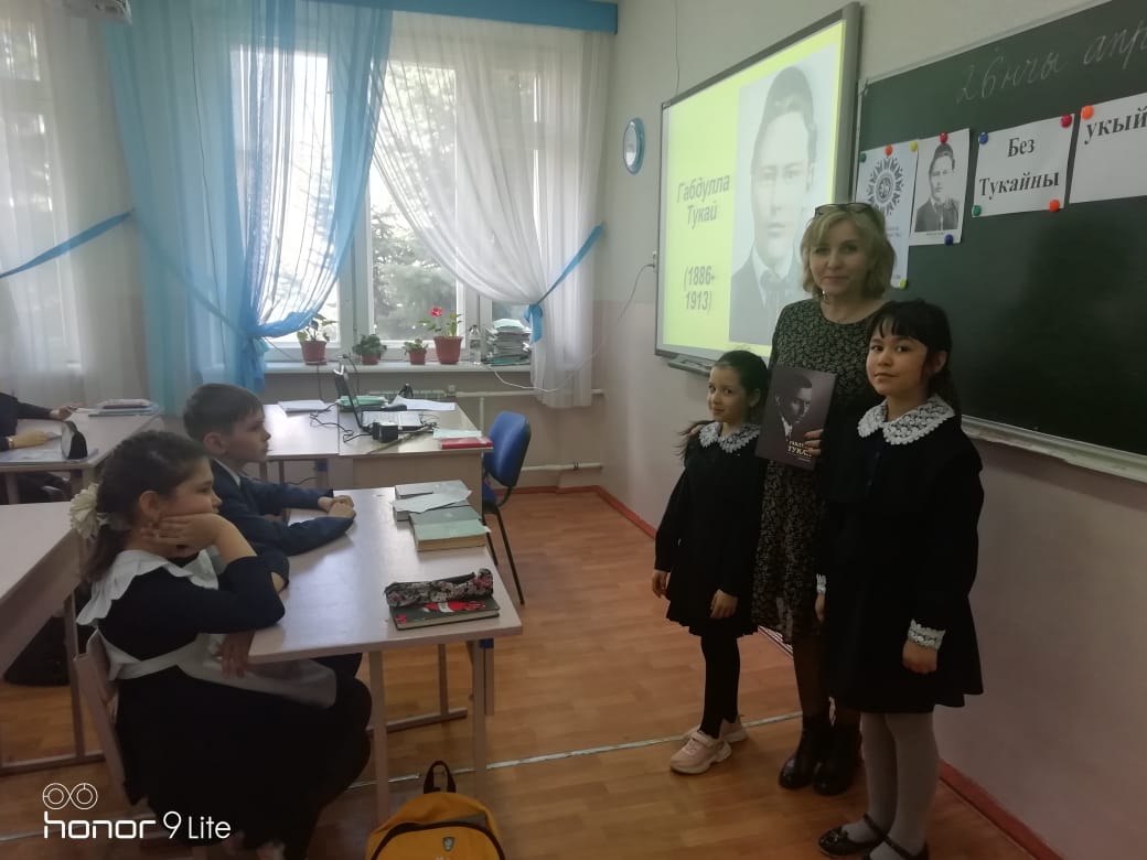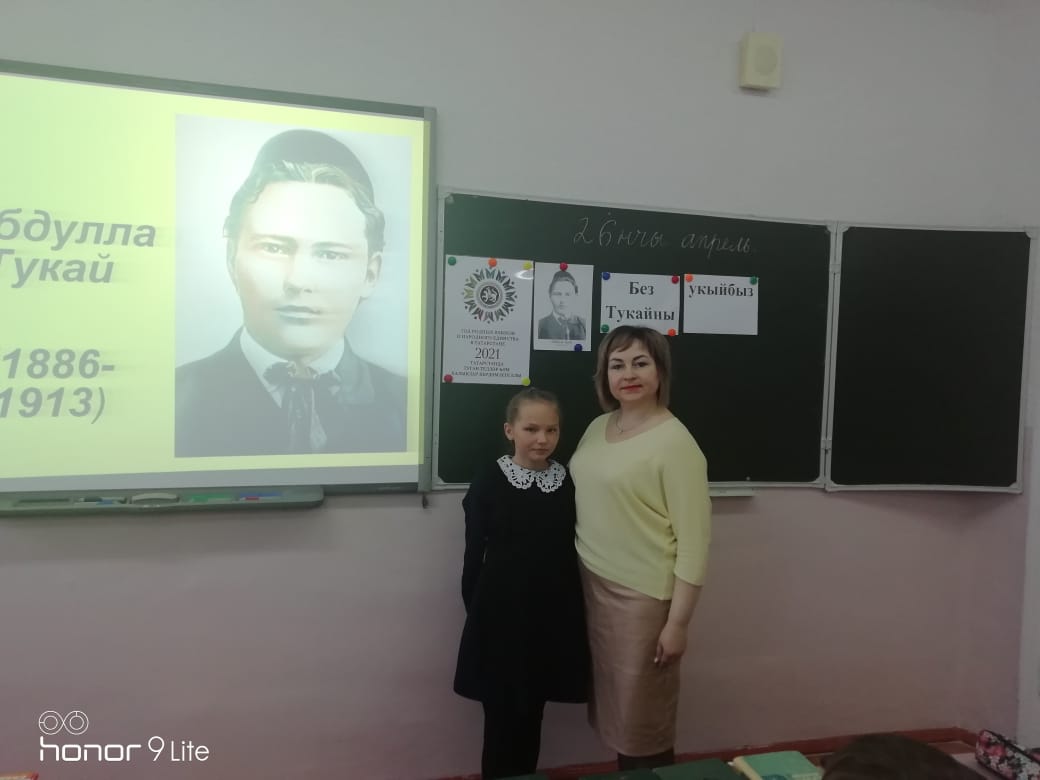 Опубликовано: 27.04.202126 апреля в МБОУ «СОШ №1 им. Героя Советского Союза М.С. Фомина г. Менделеевска» учителями родного языка и литературы Смирновой Г.Р. и Садыковой А.Н. были проведено мероприятие «Без Тукайны укыйбыз», посвященное 135-летию великого татарского поэта Г.Тукая. Учащимся 1Г, 4А, 4Г, 9Г классов была продемонстрирована презентация о жизни и творчестве поэта. Каждый из присутствующих рассказал любимое стихотворение поэта на родном языке. Ребята посмотрели фрагменты мультфильмов «Су анасы», «Шүрәле», «Кәҗә белән сарык», после поделились своми впчтлениями. В завершении мероприятия все вместе исполнили песню «И туган тел».
