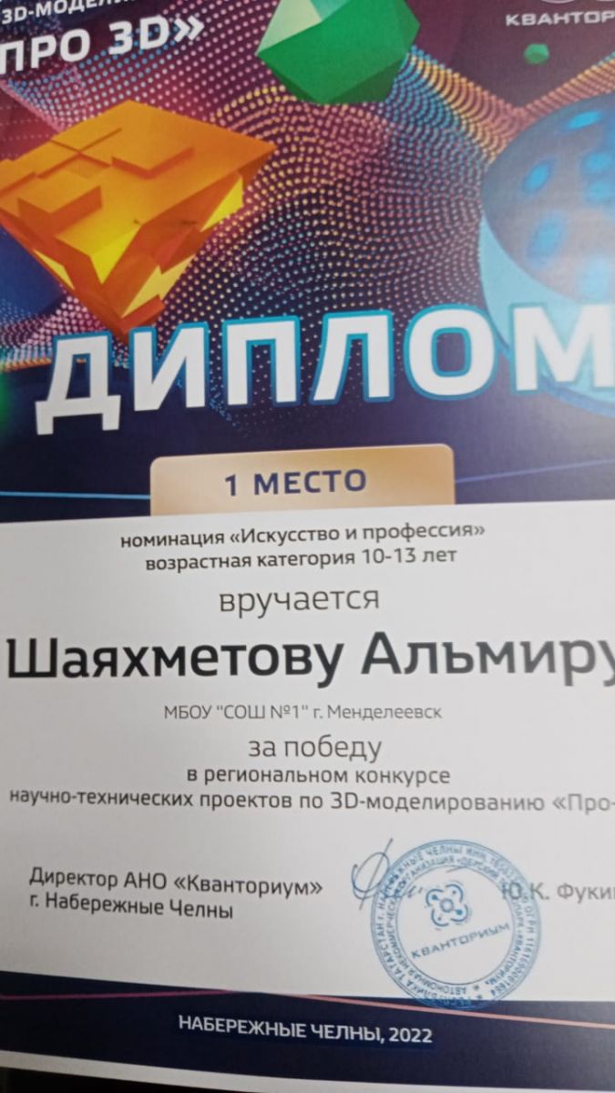 Опубликовано: 22.12.2022Ученик 5В класса Шаяхметов Альмир занял 1 место в ежегодном региональном конкурсе научно-технических проектов по 3D-моделированию "Про 3D", который проводит Детский технопарк "Кванториум" г. Набережные Челны. Поздравляем Альмира с победой и желаем новых творческих успехов!